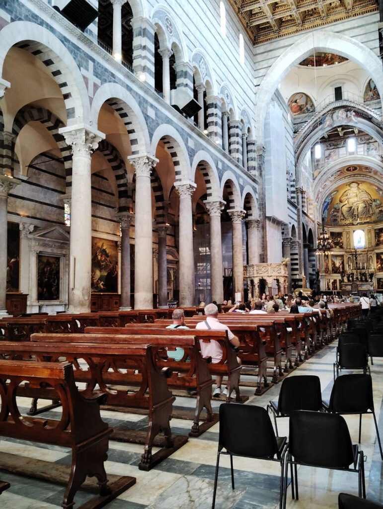 | 内観 | ・内陣のアプス部分につくられた、大きなキリストの黄金のモザイク画 ・黒と白の大理石を組み合わせたシマシマ模様の半円アーチ ・身廊上部の金箔が貼られた木造天井 ・ガリレオが「振り子の法則」を発見したというランプ |
